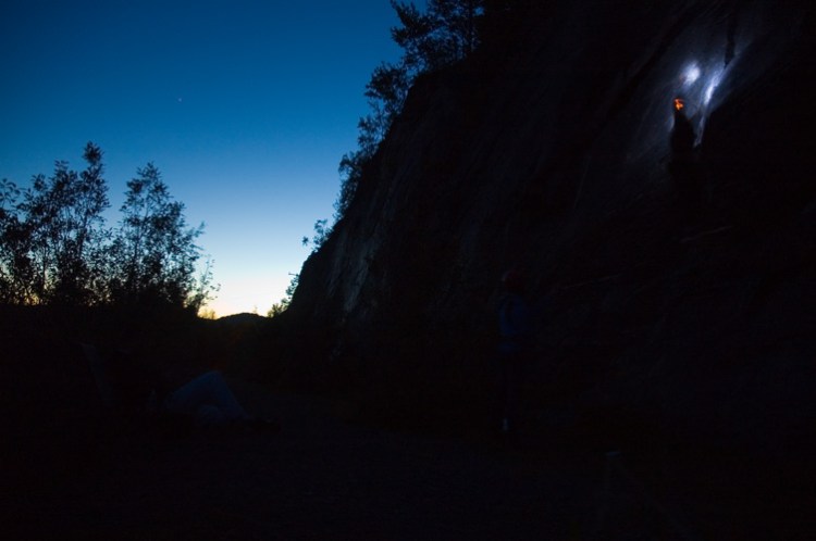 Skymning, pannlampa på hjälmen och sen upp igen.
