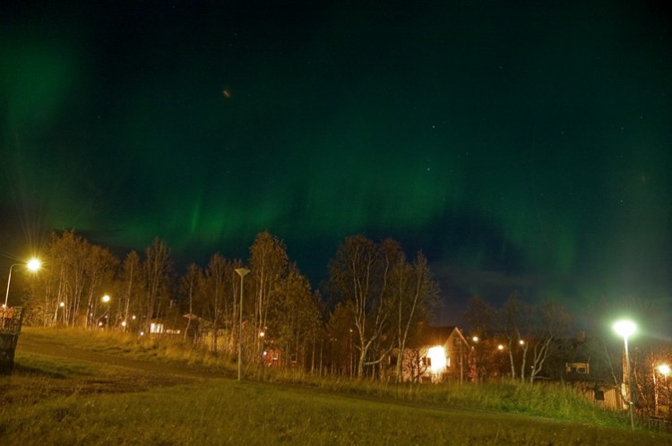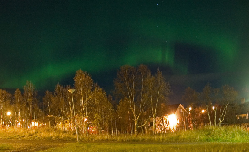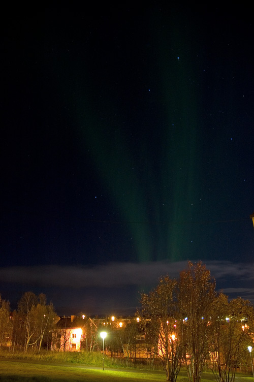 Under ett samtal tidigare i kväll med en saknad vän tog jag beslutet för en nattpromenad, vi diskutera lite om norrsken. När de så kom till kritan efter tolvsnåret hann jag inte längre än utanför dörren fören jag skymtade någonting svagt skimrande i grönt på himlavalvet. Ett sträck som blev klarare och klarar, som en enorm regnbåge endast klätt i ljusgrönt över den stjärnprydda himlen.