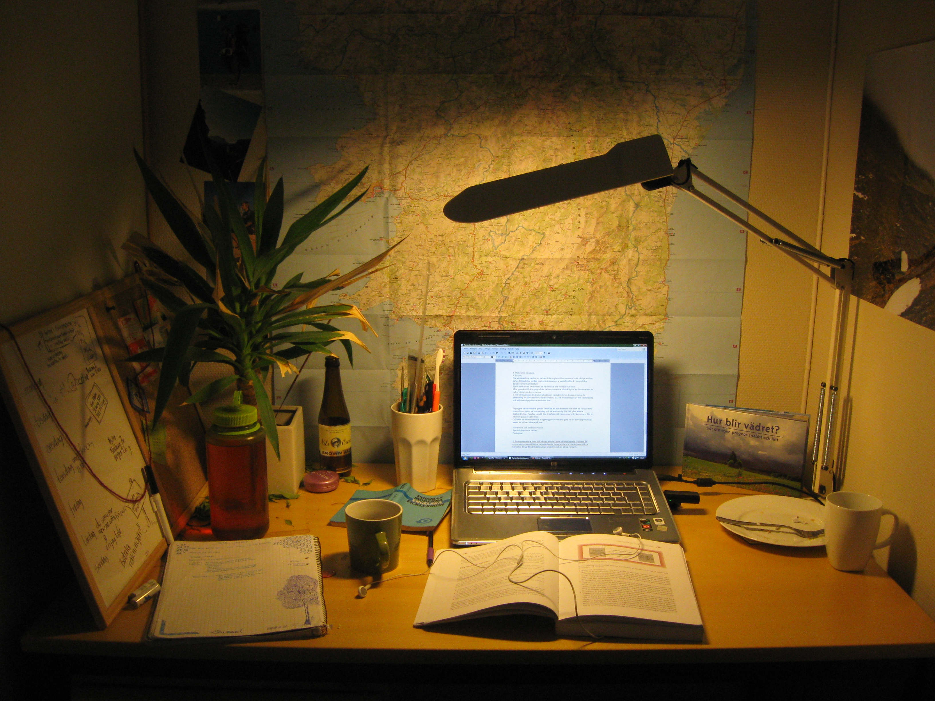 Inser att turismtentan ska vara inlämnad om 23 timmar, senast. Har börjat på två av tre frågor men förstår fortfarande ingenting. Hur det ska lösa sig det här? Ja, nog märks de imorgon. Tills dess försöker jag förstå och förmå. När jag gör inget av de så kollar jag drömskt på Korsikakartan och längtar ut. Hejaheja!