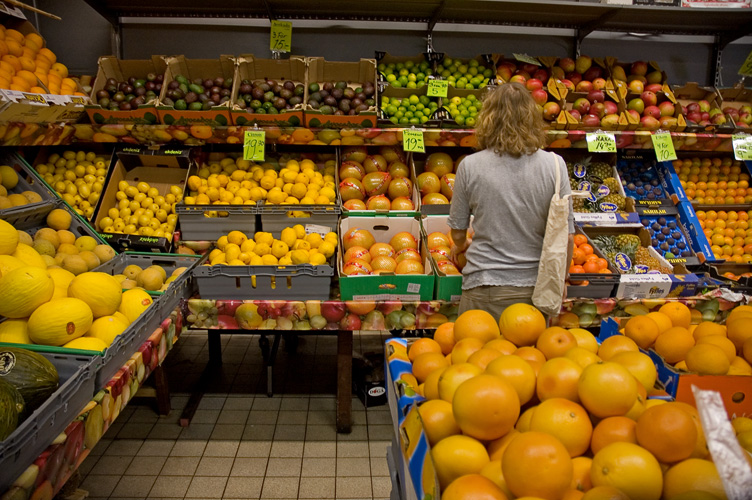 Med Linnea till affären, bara några trallande steg från porten hennes. Frukt och grönt, mycket för ögonen att vila på. Saker man aldrig hört talas om, eller för den delen sätt. Fantasifullt, enkelt och fint.