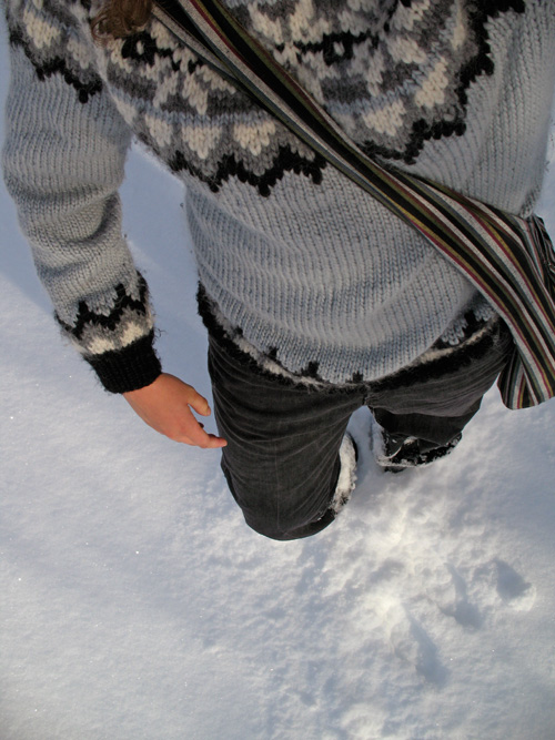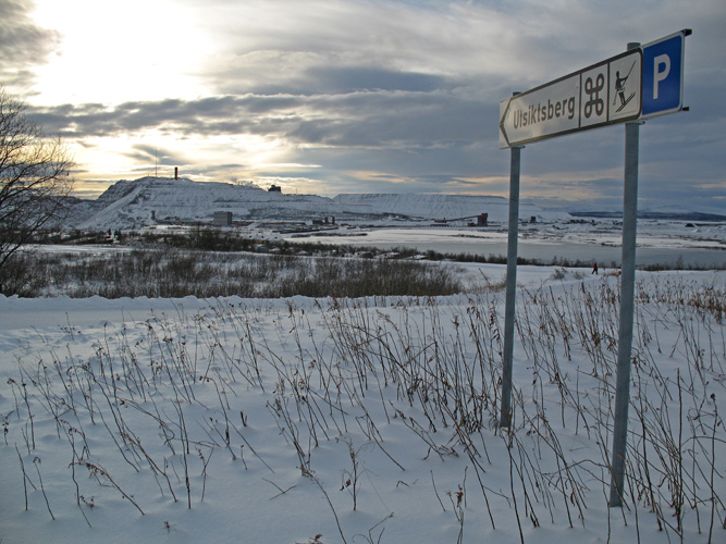 Pulsar uppför Luossavaara i decimeterdjup snö, lämlar och andra smågnagare har lämnat spår efter sig och hål överallt. Det är pistat vid liften och backen bredvid, det är spår efter någon som dragit några svängar med snowboard. Möter en grabb på väg upp med skidorna på axeln.