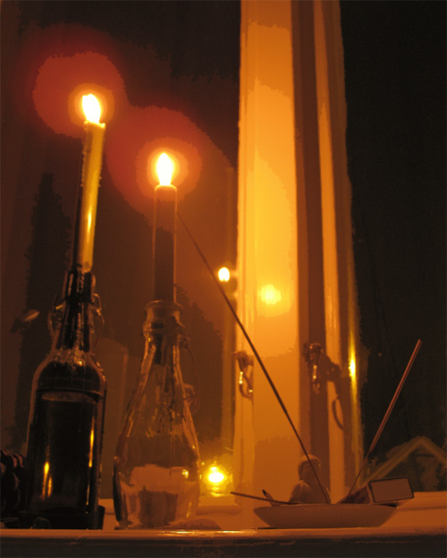 I stearinljusens sken, med gatlyktornas suddiga konturen i bakgrunden.