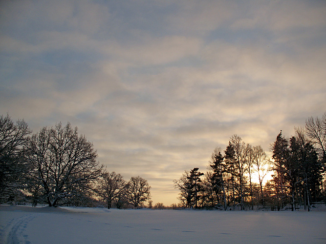 Det har mörknat på, det är kväll och det är återigen mörkt. Sov länge och kanske längre än på många veckor. En snabb frukost och ut. Skidorna på, till en början våra gamla spår ute i Tinnerö men mestadels djupsnö. En uppsprickande himmel, cumulustratus, en sol och lätta flingor som irra sig ner från någonstans långt där uppe. Desto längre bort jag kom, ju avlägsnare hördes skallen från hundarna tills det helt var borta. Tystnaden.