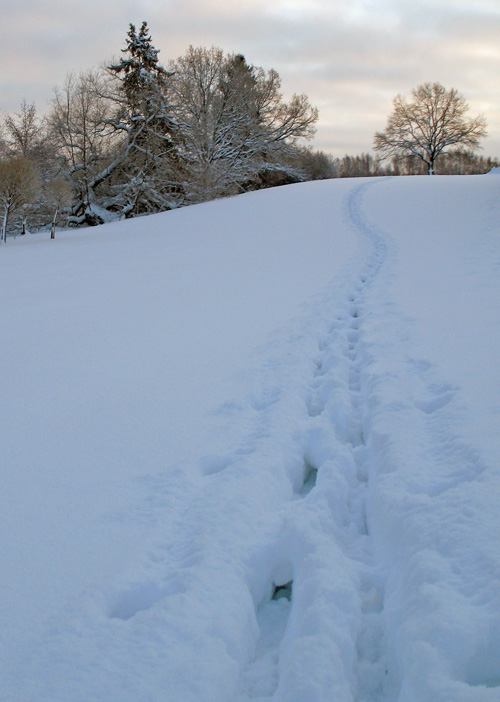 Äldre älgspår, färska från räv. Några änder som traskat på den till synes svaga isen och ljudet av det porlande vattnet. Med strålar från den sjunkande solen i ryggen vände jag så åter.