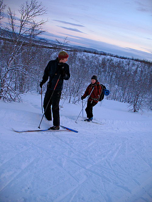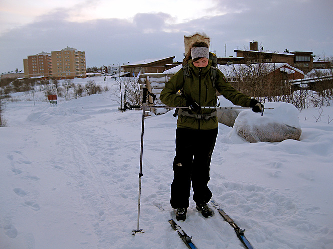 Längre och längre från stan, bakom Loussa och inte ett hus så långt man kunde se. Precis innan det vände stanna vi till, grävde i snön, använde vindsäcken som skydd mot vinden och drack varm choklad.