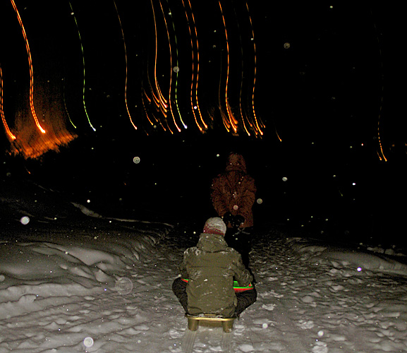 Tog oss ut på pulkaäventyr. Backen brant och farlig. I skyn ett norrsken. Bakom kröken gick vi och på rygg i snön låg vi länge och beskådade. Moln drev förbi i snabb takt och där emellan föll de vita från himlen.