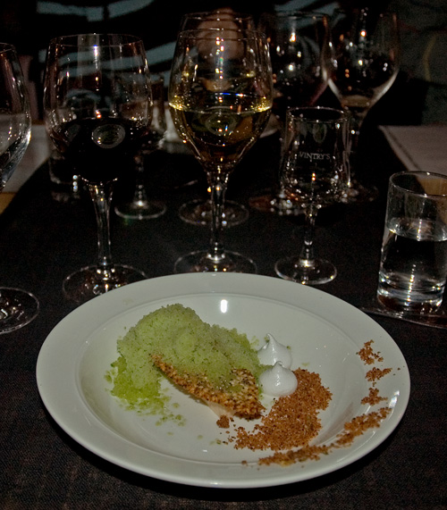 Fjällrödingmousse i mörk kräftbuljong med citrusmaräng, gurksnö och torkat rödingpulver samt sesamflarn.