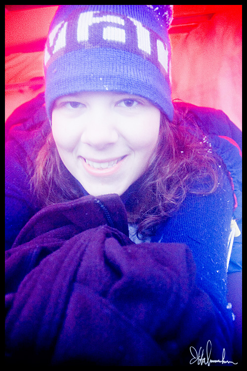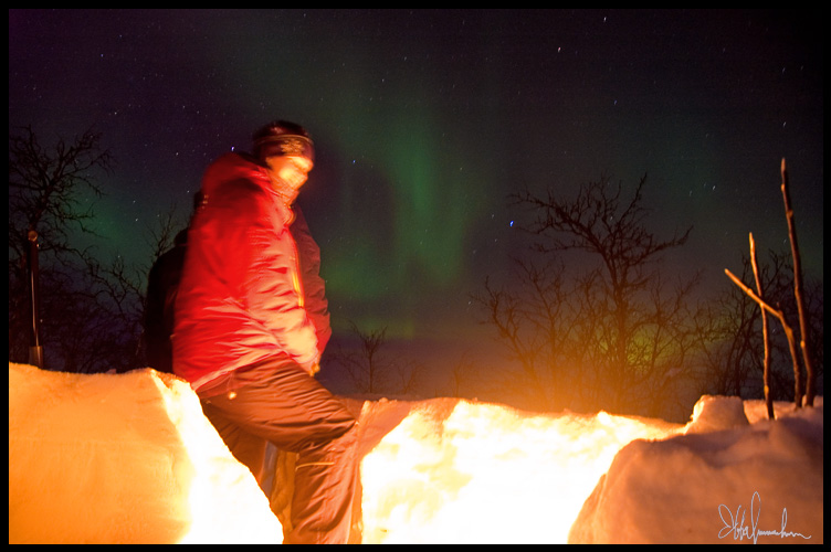 Från ingenstans uppenbarar sig ett norrsken och det dansar för oss långt in på natten. Det görs upp eld, kaffe kokas och falukorv grillas. Vi hamnar i lä från vinden bakom de höga snökanterna.