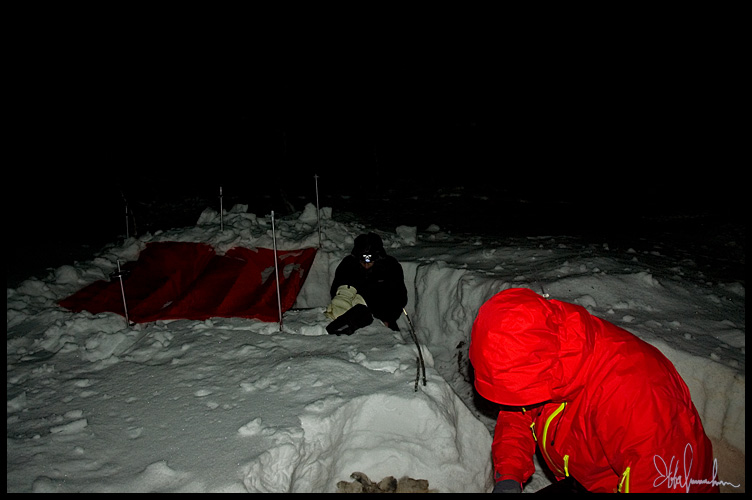 Den klara februaristjärnhimlen, vinden och minusgraderna. Ljudet av snön som knarrar och skidorna som obemärkt tar oss fram. Stannar till. Ur ryggsäcken plockas spaden fram och sakteligen nås marknivån. Snödjupet är imponerande.