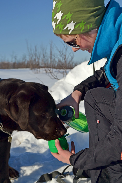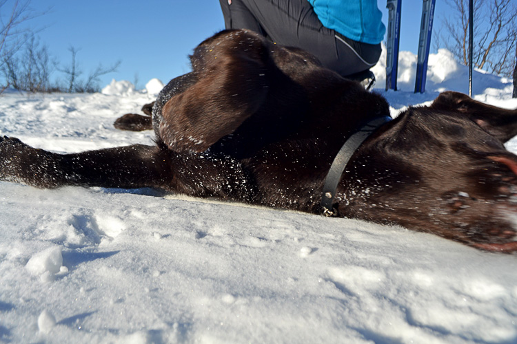 Solsken, vindstilla och sådär oväntat vackert efter veckor med blåst. I en snöhög, på andra sidan med solen rakt i fejan. Varmt, enkelt och utan bekymmer. Med sällskap och en entusiastisk liten brun som hoppa framför skidorna. Glassartur.
