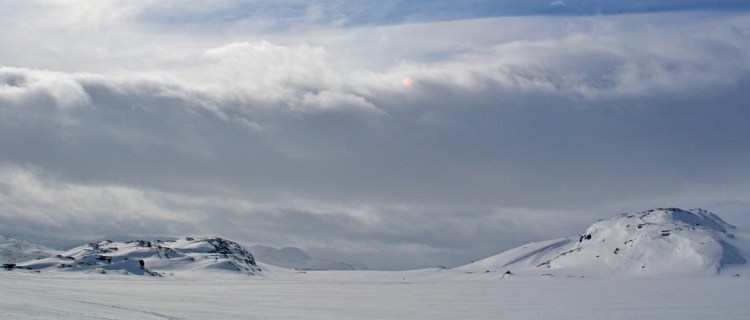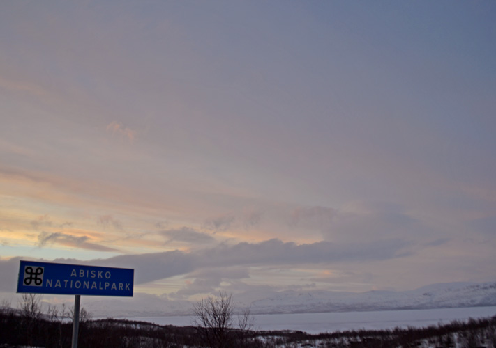 I Abisko, vid Vetenskapliga Stationen. En kvällspromenad genom byn,ner mot jokken vars is redan börjar ge upp.
