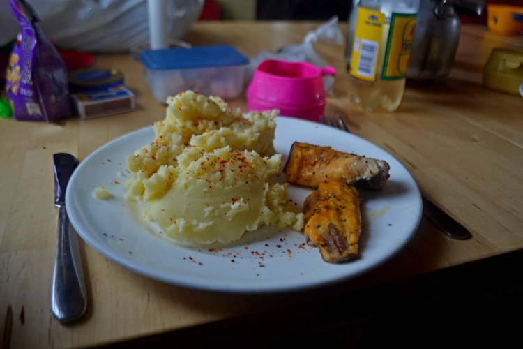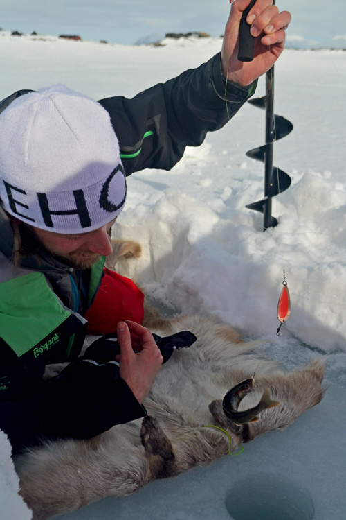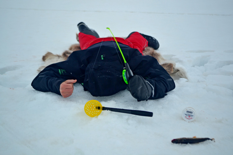 Inne i värmen i Unna Allakas stugan, ca 5 km från Sjangeli. Stekt röding och en kåsa vitt vin. Fin avrundning på bra dagar mitt ute i ingenstans.