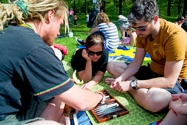 Ett trevligt litet gäng kring backgammonet, eller bara på rygg med solen glittrande i ögonen. I bakgrunden, musik i baktakt och sorlet av människor. Glada människor.