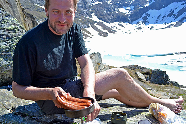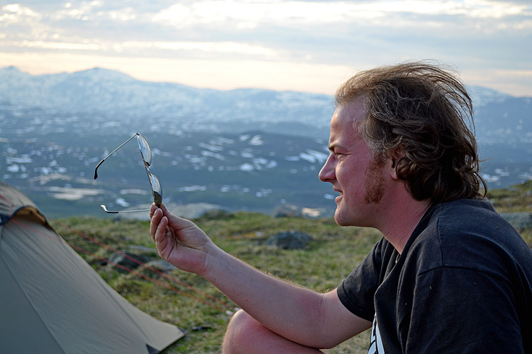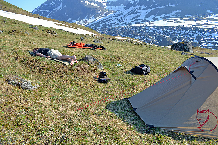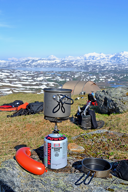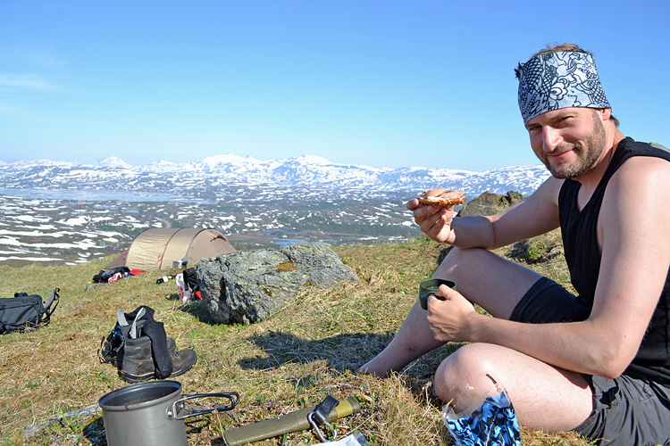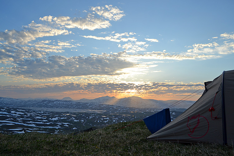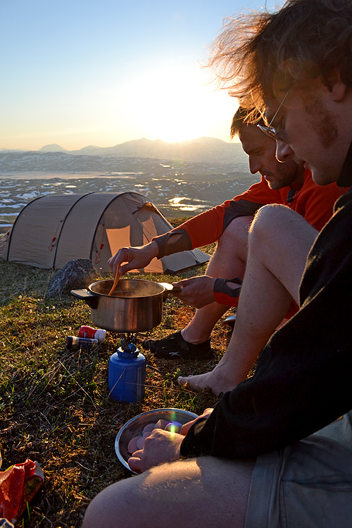 På Joans begärna slog vi läger på en fjällsluttning med midnattssolsläge. Middag avnjöts med milslång utsikt och ett glas rött.