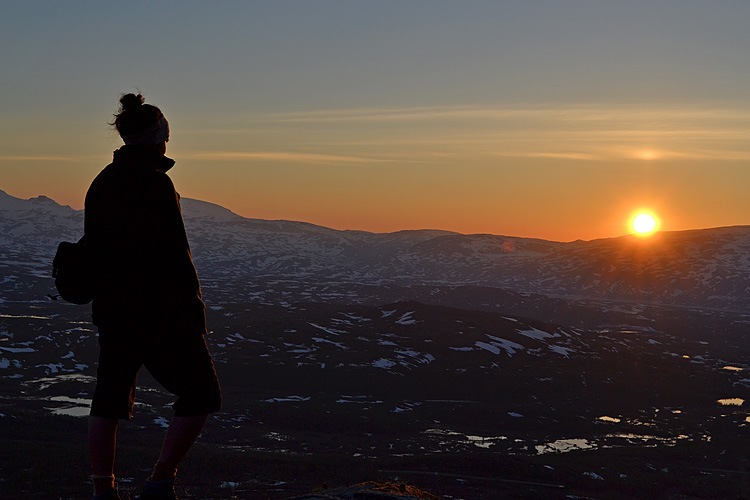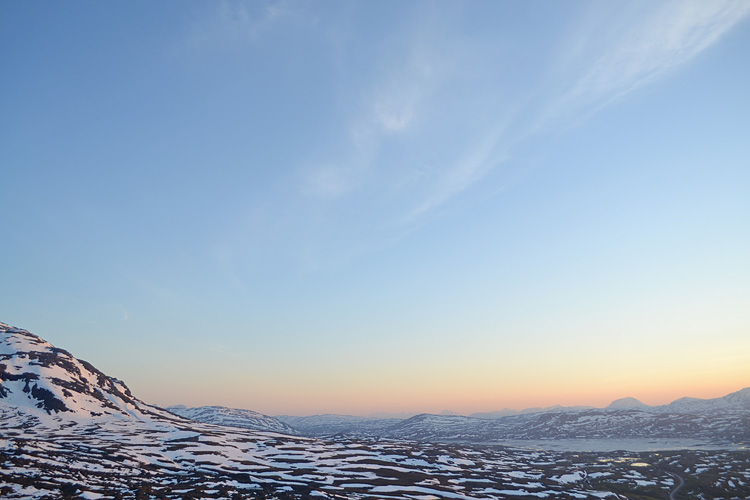 Närmsta berget hör till Riksgränsens backsystem, där bakom ligger Norge och mörkare än såhär blir det inte denna juninatt.
