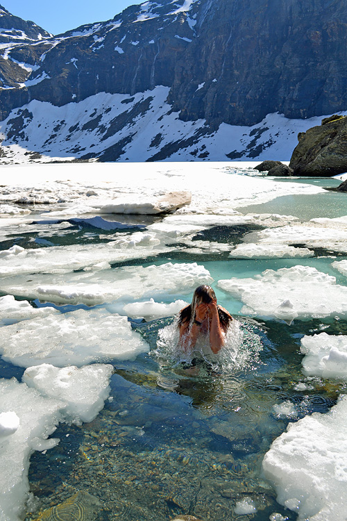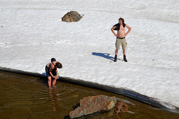 Känner på vattnet i Trollsjön, konstaterar att det är isigt.
