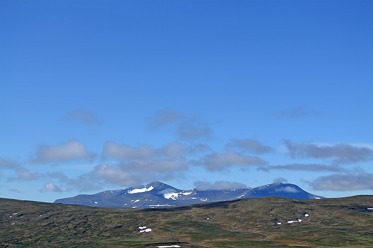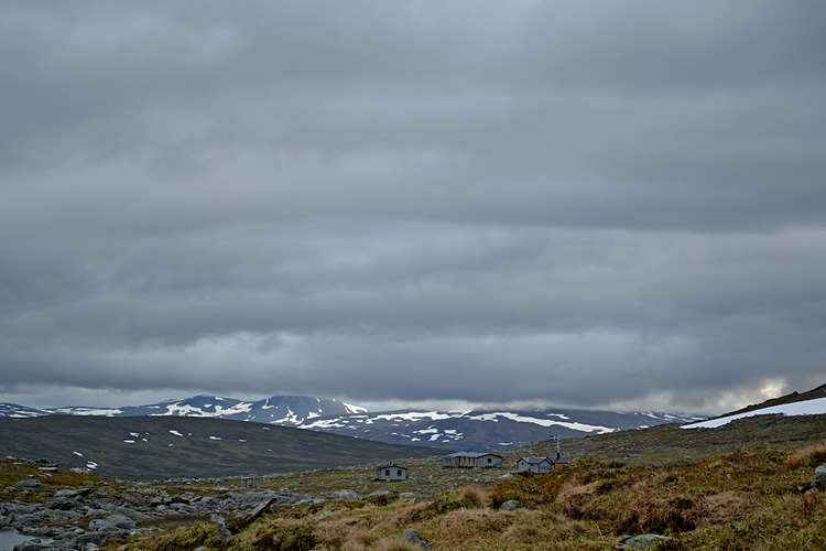På avstånd ser man hur vackert ensligt de ligger belägna, de små stugorna. Med utsikt mot Sylarna och Helags.