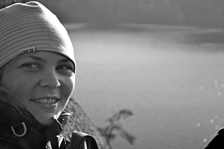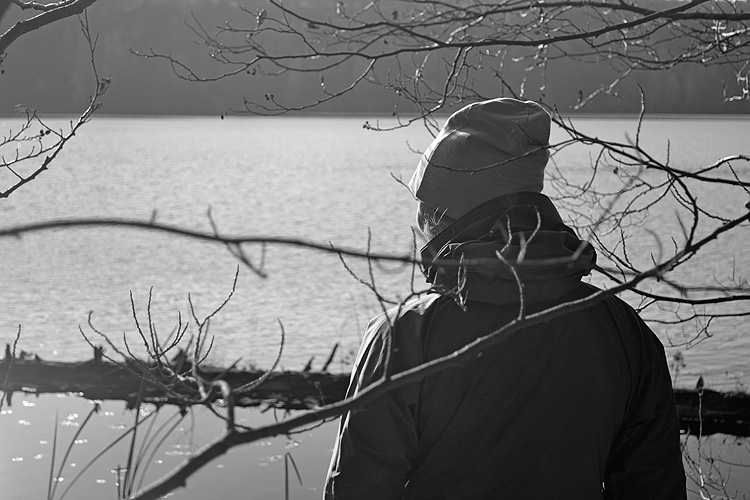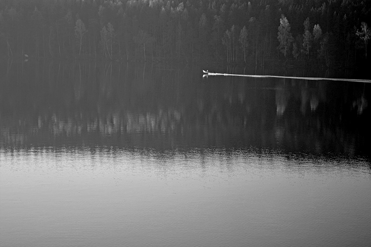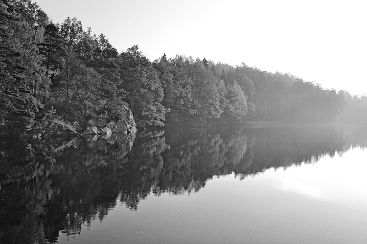 Jag tar en lång promenad utefter vattnet där morgonstrålarna dansar mellan tallstammarna. Dimman lättar sakta över sjön.
