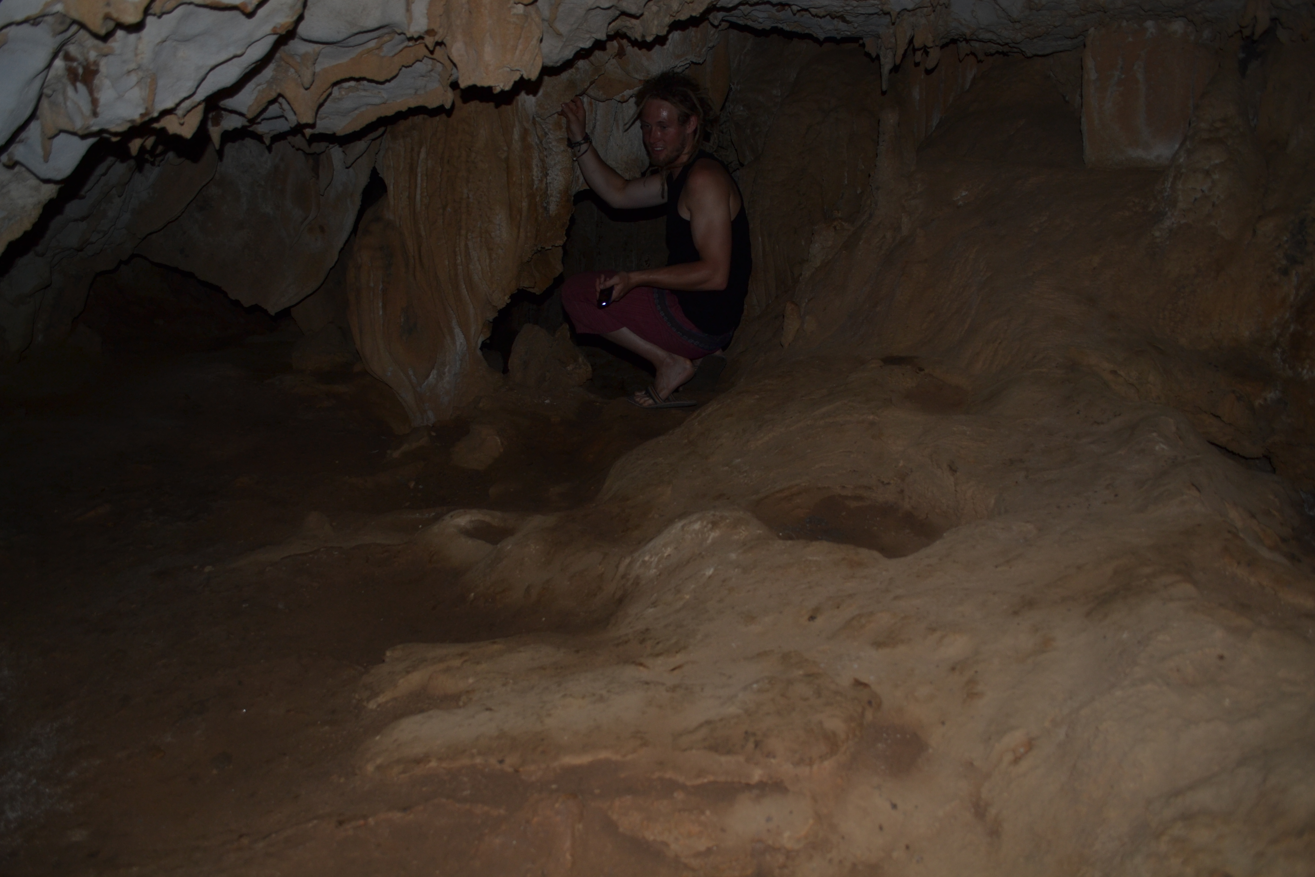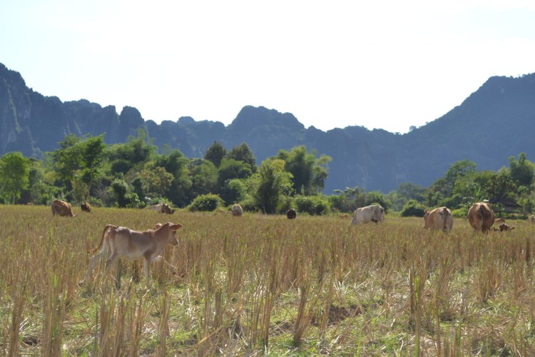 Någon dag senare är vi på väg mot en annan grotta och färden går över ett risfält och vi möts av många korta små kossor som glatt hoppar förbi. När vi närmar oss grottområdet står där en man som vill ha pengar för att släppa förbi oss och vi kan inget annat göra än att betala 20 000 kip för att slippa bli jagade när vi försöker klättra över taggtråden och komma in på området. Men grottan är fantastisk och det är roligt att klättra upp för alla stegar upp på toppen av kullen och känna hur svetten bara rinner av en. Utsikten är fantastisk och det är fint att bara sitta för en stund.