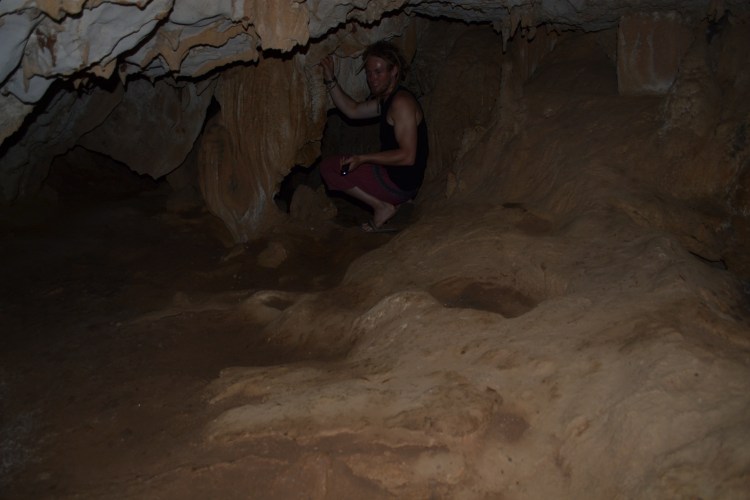 Runtomkring staden tonar bergen upp sig och det är ett fantastiskt landskap. Fick hör att på cykelavstånd finns det fina grottor att nå. Så vi hyrde ett par cyklar och trampa iväg. Bara någon kilometer senare mötes vi av ett litet bås där vi behövde betala 2 000 kip var för att passera och 2 000 kip för att få ta med cyklarna (2 000 kip är lätt omräknat 2 kr, så egentligen är det inga pengar). 100 meter senare får vi inte passera bron med våra cyklar, så vi går så till fots mot grottan. Grottan som visa sig vara grottor och en flippflopp som enkelt lagades med silvertejp i de mest branta partierna.