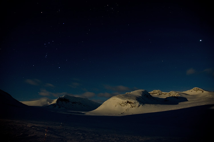 Skymningen lägger sig och skuggorna leker på massivet. Precis där vinterleden letar sig runt Herrklumpen låter månen sina strålar dansa magiskt och skapar en otrolig mäktighet. Jag står uppå taket länge och begrundar, förundras. Står där tills det blir för kallt, byter om och glider ut med skidorna. Det är en kylig vind som biter i kinderna men där ute i månens sken trampar jag uppför flera gånger för att njuta av några enkla svängar utför på turskidorna.