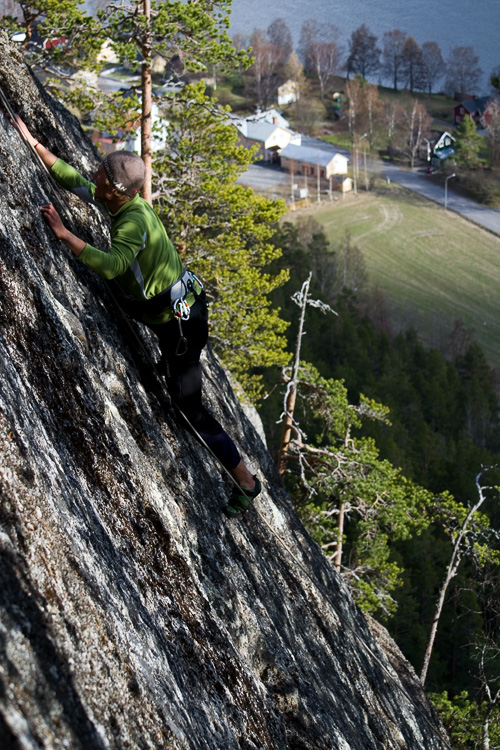 Vi tar oss ut, en bra bit från staden till en plats där lodräta bergväggar tycks växa rakt upp ur skogen. Det är en plats de kallar Stugun, nära till älven och med ett riktigt härligt solläge. Gör några trevande attacker mot väggen, vissa går bra mycket bättre än andra men jag blir glad utav att bara få vara här. Fint med utepremiär för klättringsäsongen.