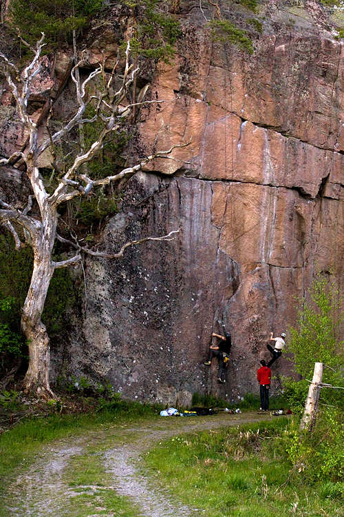 Det är någonting speciellt med att få äta frukost utomhus och någonstans ifrån hörs fiolspel. Solen är stor och varm. Vi fyller dagen med klättring och det går ruskigt bra. I bilen hem pratar vi gamla fjällminnen och spånar på nya.