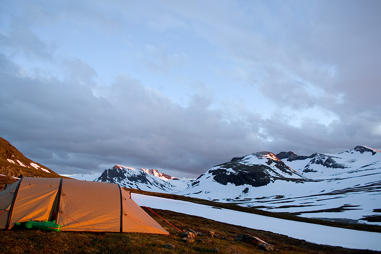 Solnedgången igår var lugn och stilla, jag stod länge och begrunda den innan jag kröp ner under sovsäcket i mitt tält. Första natten med en liten plan om många fler.