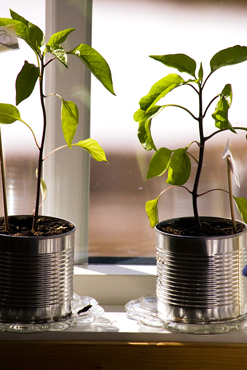 Vi puttade ner frön under vintersäsongen, nu växer och gror de, våra paprikor.