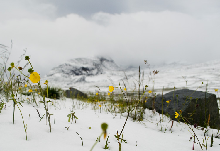 Att se flingor återigen sakta börja falla från skyarna ner mot smörblommorna som står och svajar i det som återstår från den storm som drog fram igår.