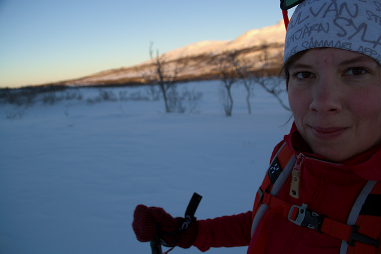 Solen sjunker ner bakom Storulvåfjället och temperaturen sjunker snabbt. Kinderna färgas röda och kylan biter till ordentligt. Dagen har varit sol, vita vidder och blå himmel. Det finns inga tvivel på att jag är glad att vara tillbaka.