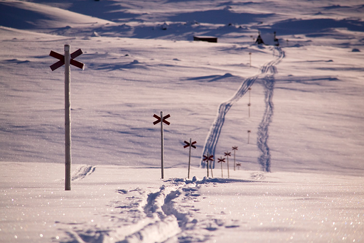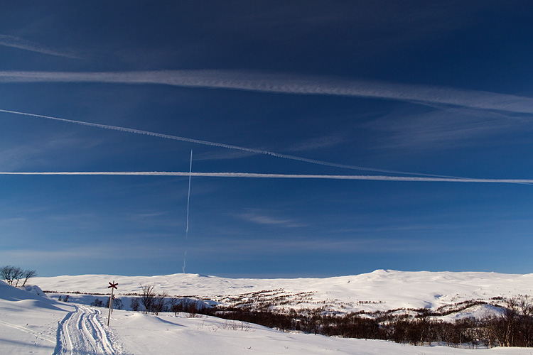 Jag ger mig av, det är eftermiddag och efter sig på himlen lämnar flygplanen ett rutnät av något som nästan kan liknas vid tunna slöjmoln. Det har blivit dags att bege sig hemåt och jag har ingen brådska, jag tar en annan väg hem än den jag kom på. Det är lite bakhalt i uppfärsbackarna mot kalfjället och jag kan tänka mig att det varit bra glid utför under dagen.