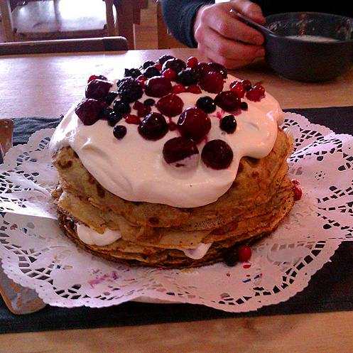 En halvtimme senare när jag satt mig ner vid frukostbordet, efter en skottrunda kring stationen, hörs sången komma från P-köket. Intågande kommer de, vackra som de är, med en pannkakstårta i händerna. Det är nästan så att jag blir rörd till tårar. Pannkakstårta, den bästa tårtan som finns och denna är större och vackrare än alla jag tidigare sett. Men kanske det bästa av allt är att få dela den med vännerna kring bordet.