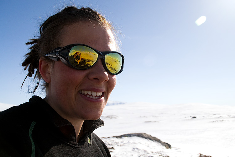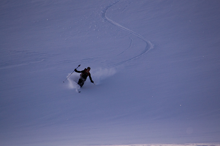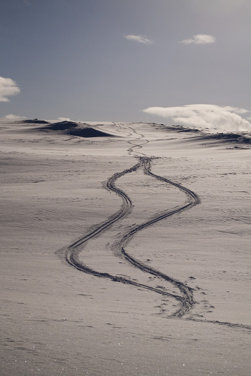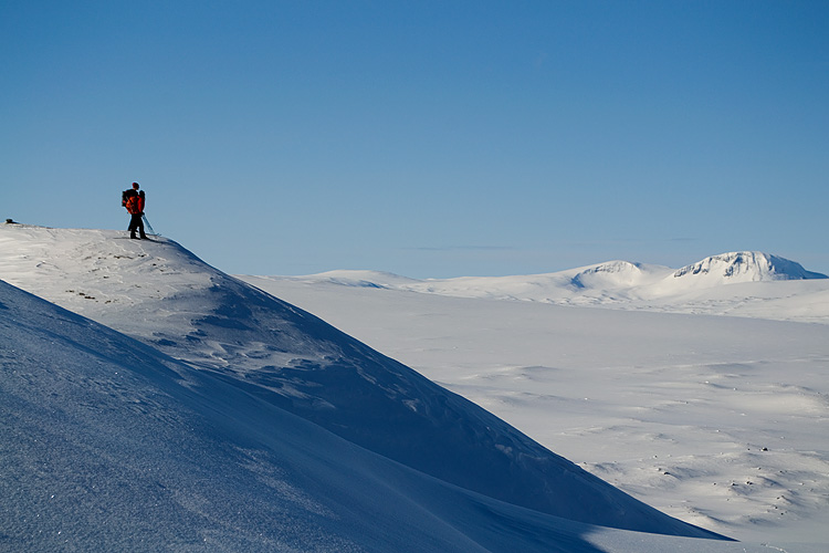Vi lämnar stationen bakom oss och tar oss sakta upp för backen. När vi rundar krönet i sadeln mellan herr- och fruntimmersklumpen breder vidderna ut sig. Jag är lite feg så jag skråar den första biten utför tills jag vågar släppa på och ta några telemarkssvängar på turskidorna. Snön är härligt mjuk trots allt och min vän passar på och tar ut svängarna ordentligt. Jag ramlar ett par gånger, han skakar bara på huvudet och vi skrattar.