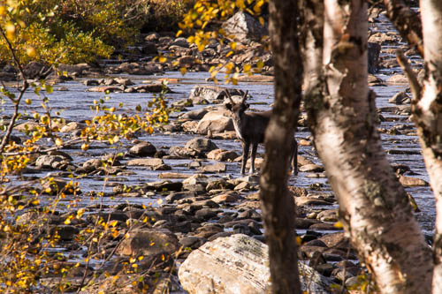 Så rullar bussarna iväg, ja det är faktiskt två fulla bussar som kör på vägen mot Handöl och svänger höger upp på vägen mot Storulvåns fjällstation. Landskapet är lika vackert som alltid men än lite mer färgstarkt än vanligt. Det är mycket folk som strömmar in på stationen och det blir för en stund väldigt intensivt där kring buffébordet vid frukosten. Det är många bekanta ansikten som skiner upp och när jag smiter undan stöket och tittar in i köket blir mitt leende än bredare. En lång och redig kram och ett härligt återseende. Det blir fler kramar och hej innan jag sakta glider lite åt sidan, byter om och kliver ut genom dörren. Ner för den lilla backen, åt höger för att sen ta vänster över bron. Förbi de röda gamla husen och utefter Storulvån. I det låga vattenståndet, bland stenarna som blottats i ån står en renkalv och tittar nyfiket innan den springer ikapp sin mor på myren.