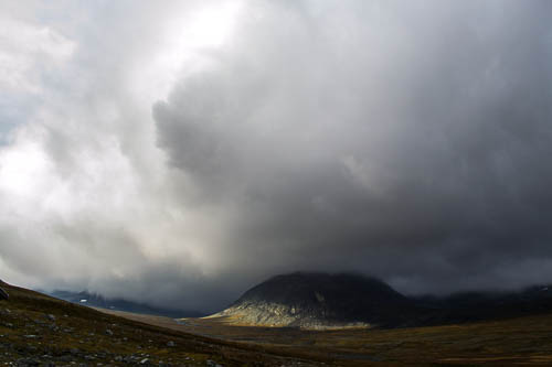 Så kommer morgonen igen, det blåser och duggar i sidled. Vinden tar i enda från Norge, låter sig inte hindras och tar tag i allt som inte funnit sig en fast plats på fjället. Jag vill inte riktigt ge mig ut, hellre vill jag stanna inne i värme och låter lunchen komma. Vi äter tillsammans och jag bestämmer mig för att det är dags. Att det är dags att packa ryggsäcken och knyta skorna.