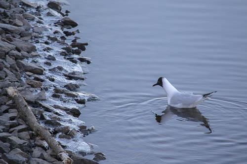 Utefter älven in mot centrum, frost på gräsmattorna och frusna tussilagos.