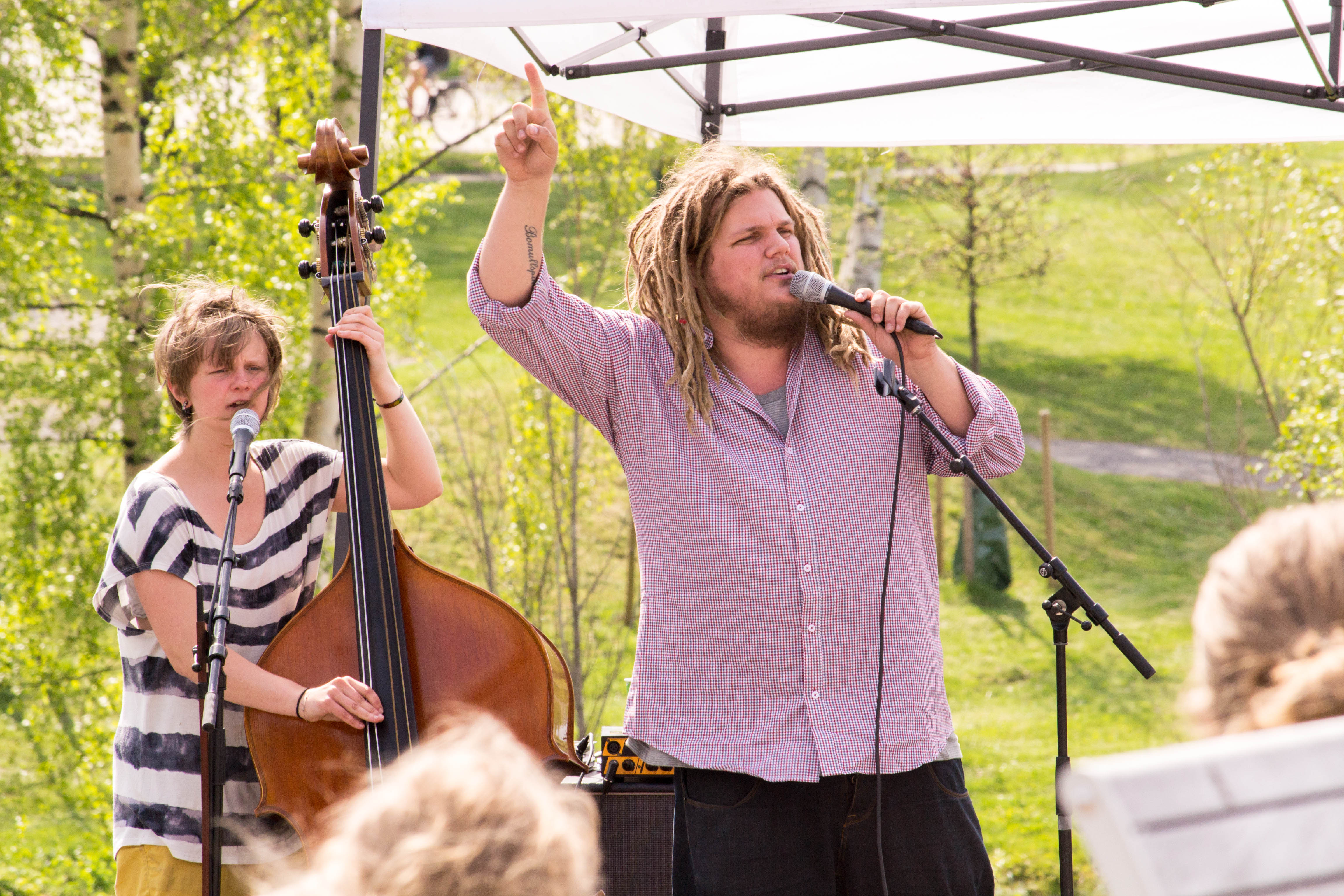 Det är alltid lite motigt att kliva innanför dörren på universitetet när solen skriker ”nej, stanna här ute med mig” efter en. Men efter några timmar sprang vi ut som kor på grönbete när det vara dags för lunch. Borta vid campusdammen höll dom till, Partiet (eller 3/8 av gänget) och bjöd oss på en härlig spelning. Partiet, solsken och mat, kind of made my day.