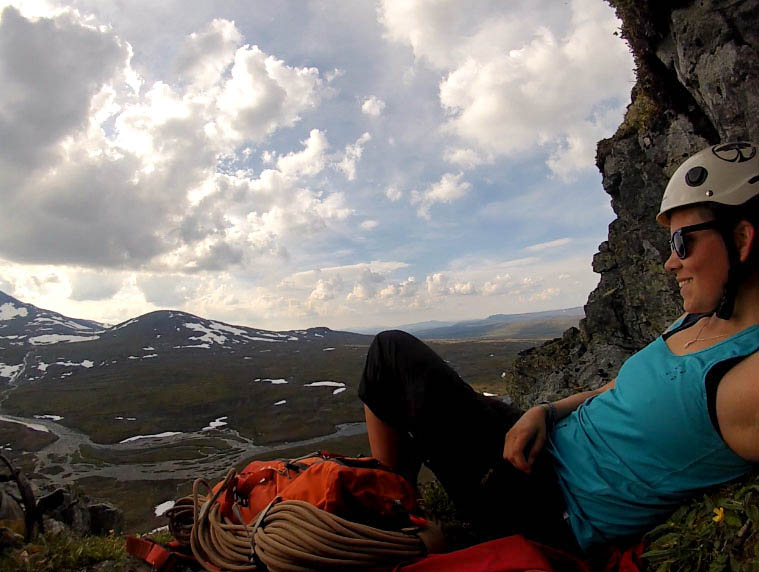 I lä vid den vertikala väggen packade vi upp och drog på oss selar, hjälm och annan utrustning. Pirrig i magen och fylld av förväntan. Premiärklättring i fjällterräng. Ett enda stort leende.