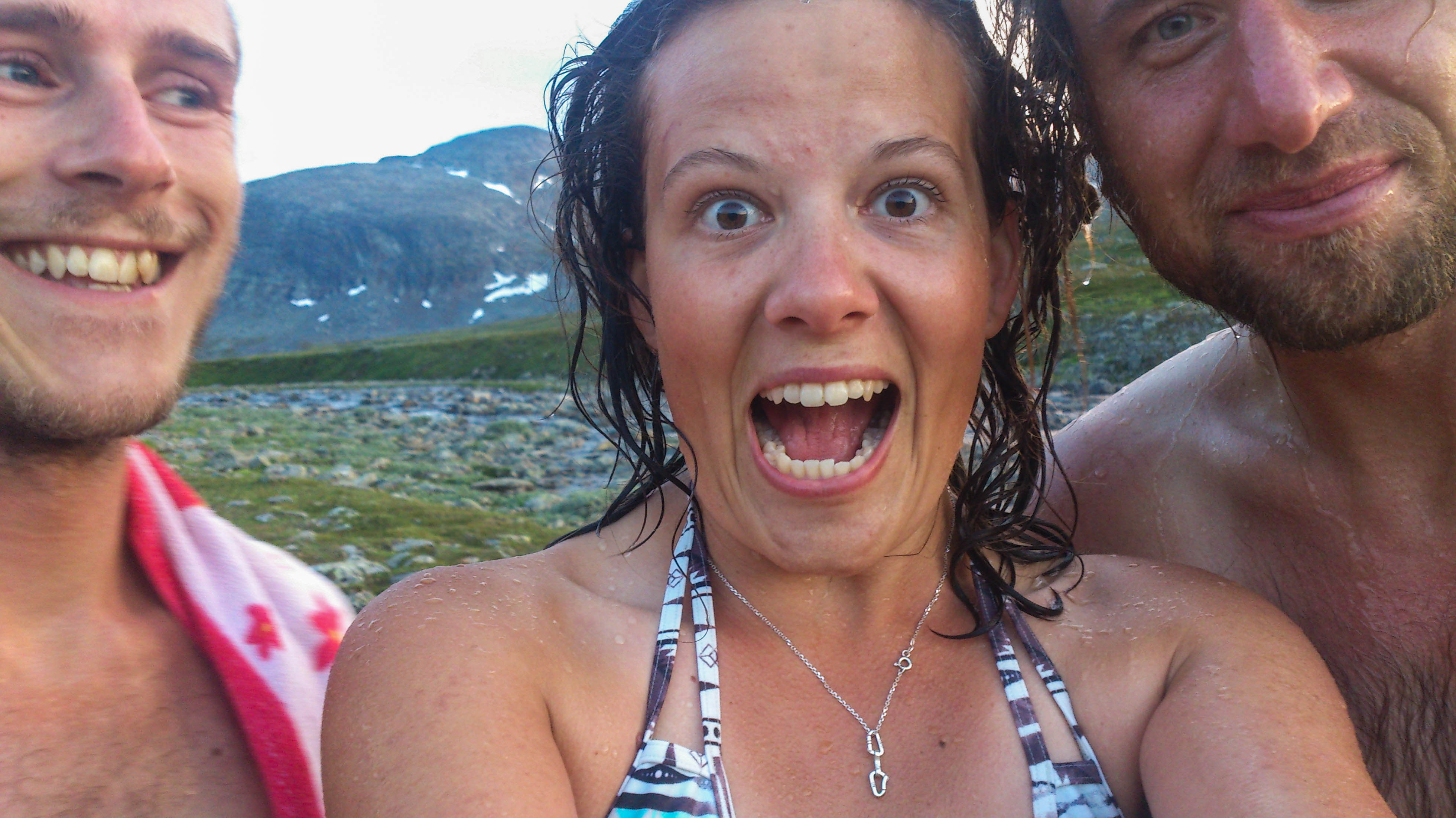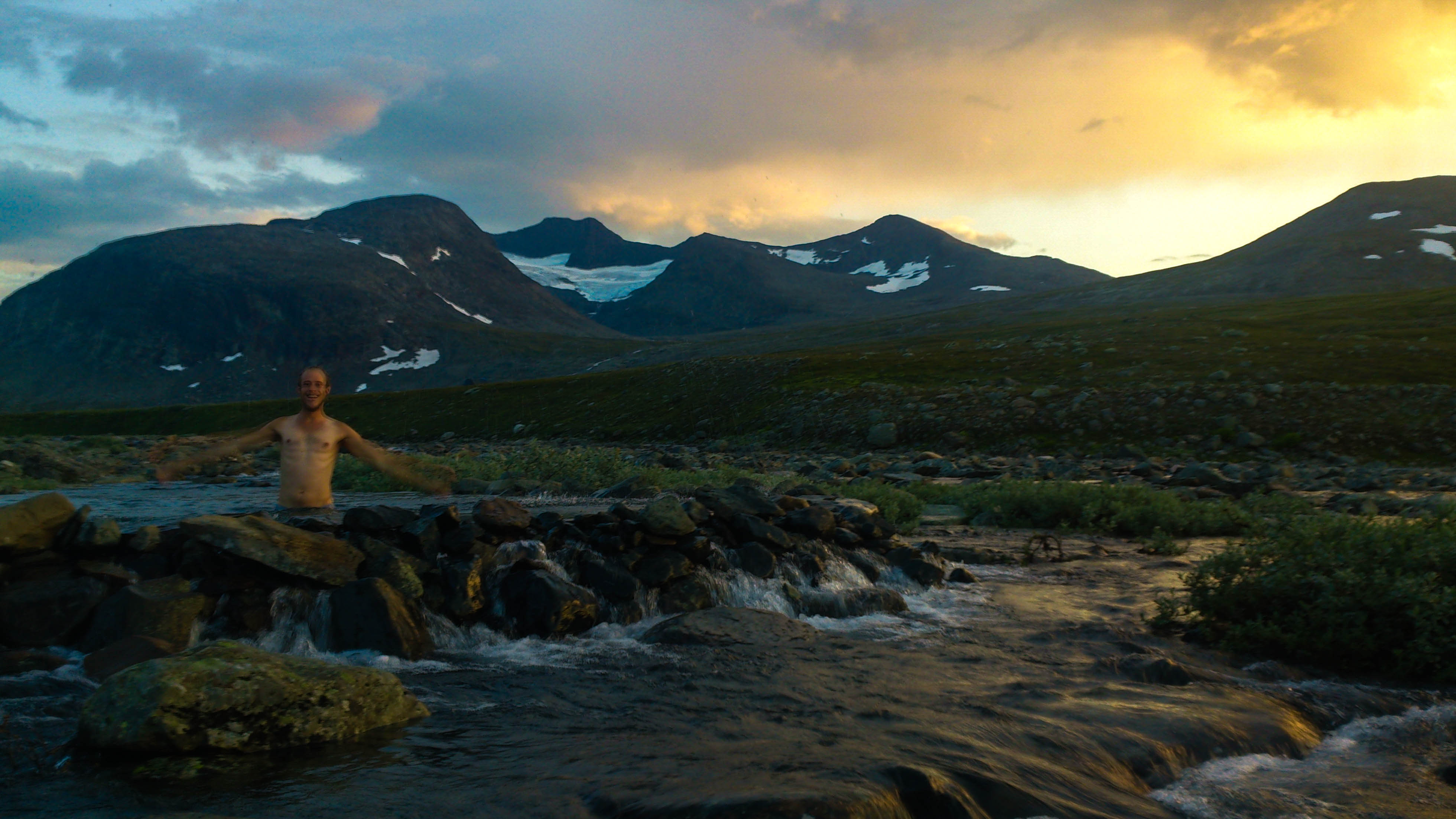 Regnet har avtagit, men marken är fortfarande blöt. Solen börjar sakta ta sig genom molnkanten ovanför bergen och vegetationen glittrar som om de var gjort av någonting ömtåligt. Vi tar stigen förbi stationen och tälten, ner mot älven och den vedeldade bastun. Kvällen är stilla och alldeles magiskt. Inne i bastun är det behagligt och vattnet som förångas när det slängs på, får fukten att pärlas sig på huden. Precis utanför ligger sylälven och poolen vi byggt. Den friskhet som sköljer över en när man doppar sig mellan varven sprider sig som en skön känsla i kroppen.