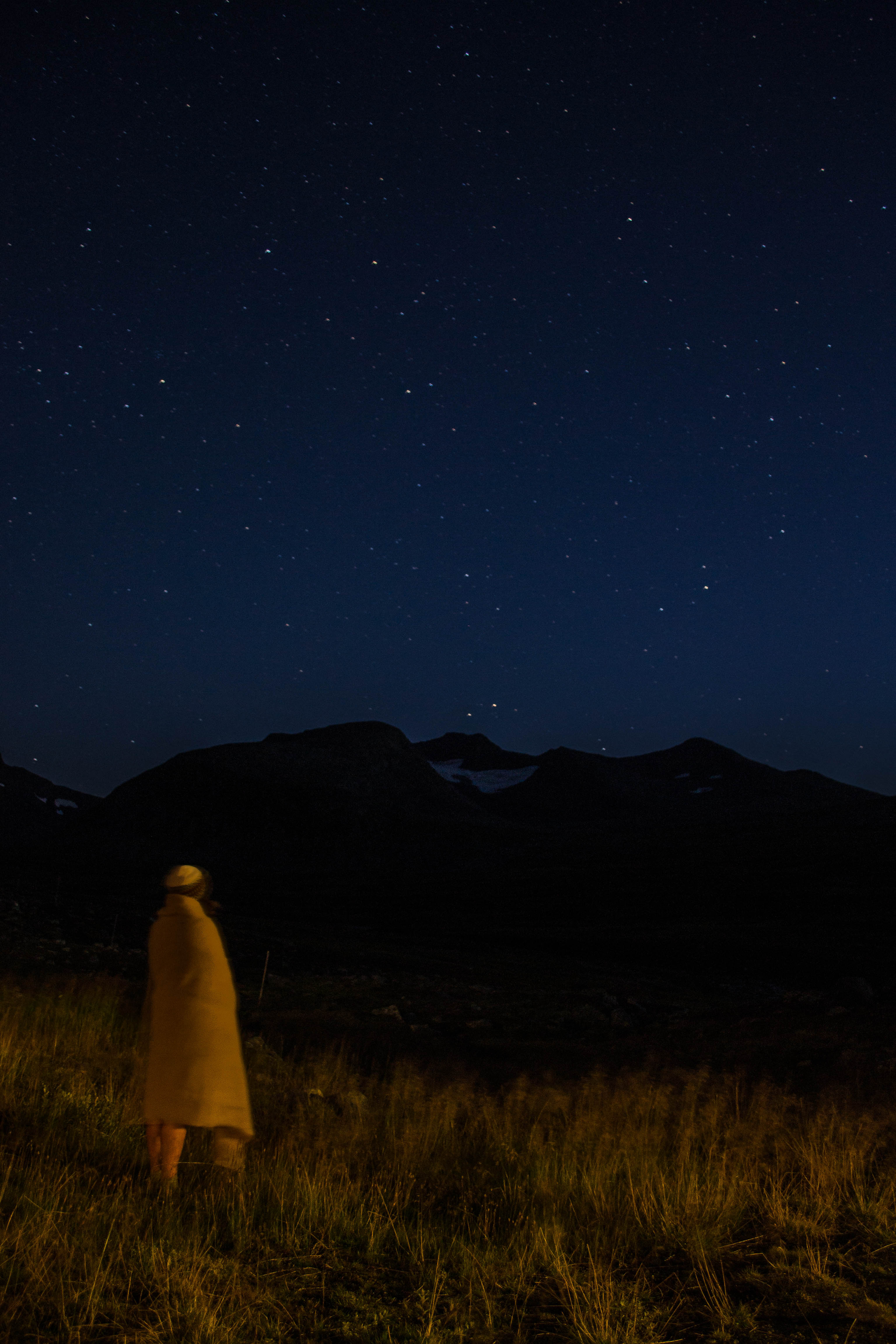 Glädje och lycka, hösten är här och där under stjärnhimlen stod jag med massivet som en väldig kuliss framför mig. Sista natten i augusti. Ensam med himlen sprayad till tusen av glittrande och sprakande stjärnor och med blicken fäst uppe i den mörkblå skyn. Förlorad i det oändliga.