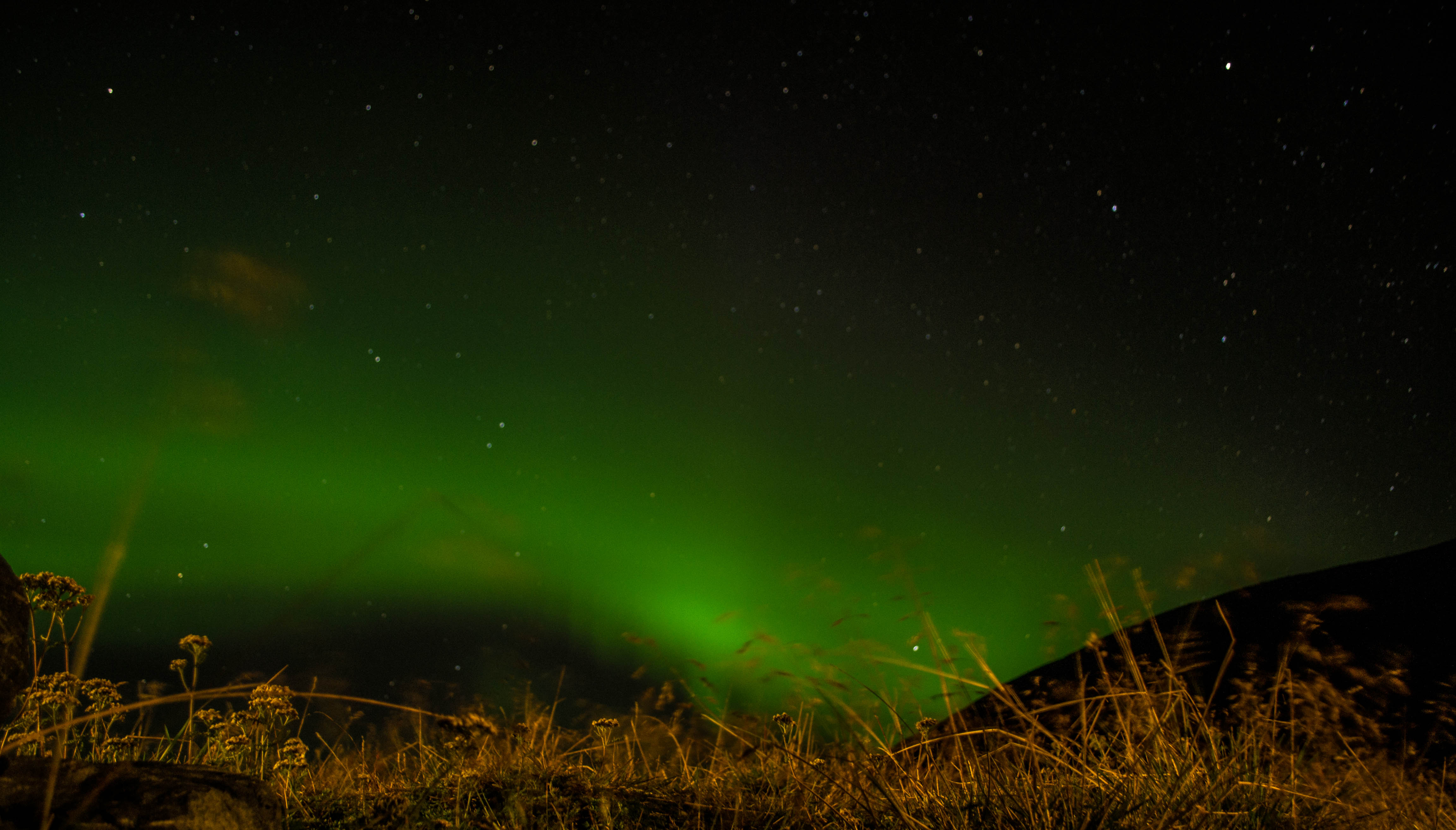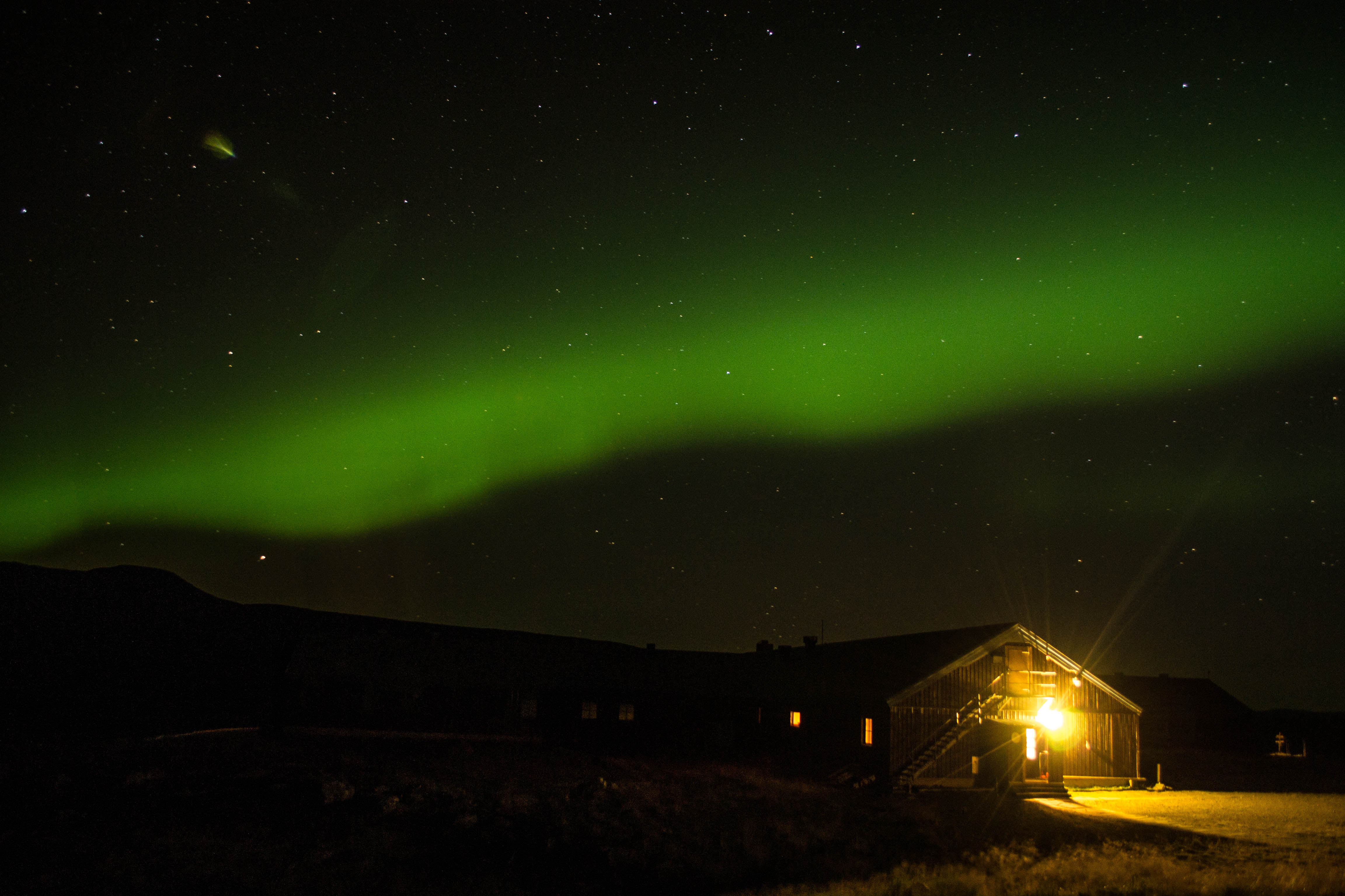 En väldighet så stor och leendet. I norr bredde norrskenet ut sig, slingrade sig fram för att så växa till ett enda stort skådespel. Och där stod jag, ensam på mitt fjäll. Ensam med stjärnorna och de vilda färgerna som kastade sig fram och tillbaka över natthimlen.