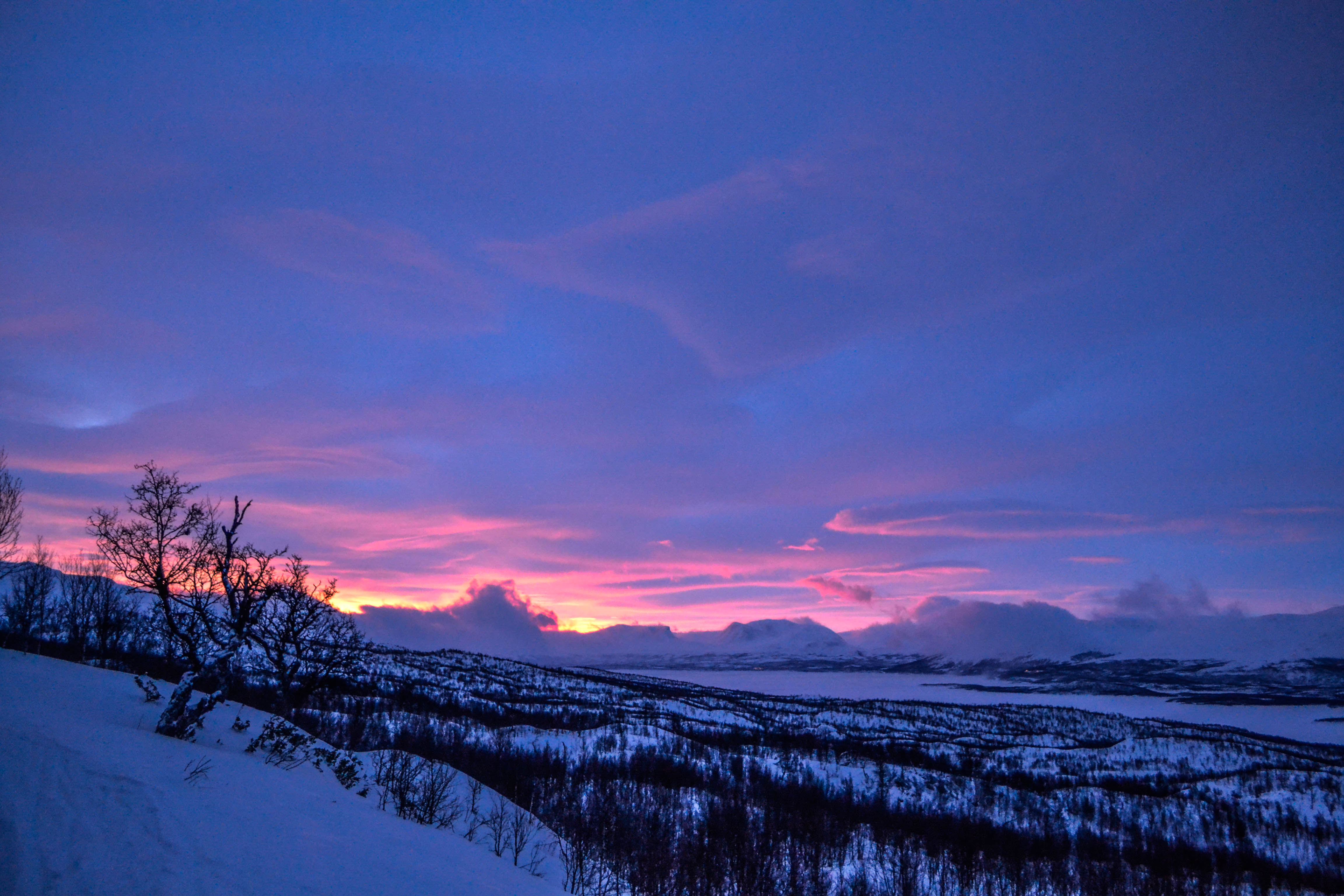 Under natten blåser det upp och drar kring knutarna. Trots det rejäla och mysiga täcket sover jag dåligt, men när morgonen kommer tar vi sovmorgon. När vi kommer iväg är klockan nästan lunch. Det är utför ner till sjön och det går relativt lätt, det är till och med kul. Det är kul att trassla sig ner för de brantaste backarna, kryssa mellan björkar och andas den lätta luften. Ute på Torneträsk är det lite kärvare, det är nederbörd i luften, vinden kommer snett framifrån och biter i kinderna. Vi skidar på, mörkret sänker sig och pannlamporna tänds återigen. Skenet stänger allting ute förutom spåret framför och vinden som får snön att virvla och driva. När vi senare på kvällen är tillbaka i Abisko äter vi 3-rätters i restaurangen och det är förbaskat trevligt. Gott också.