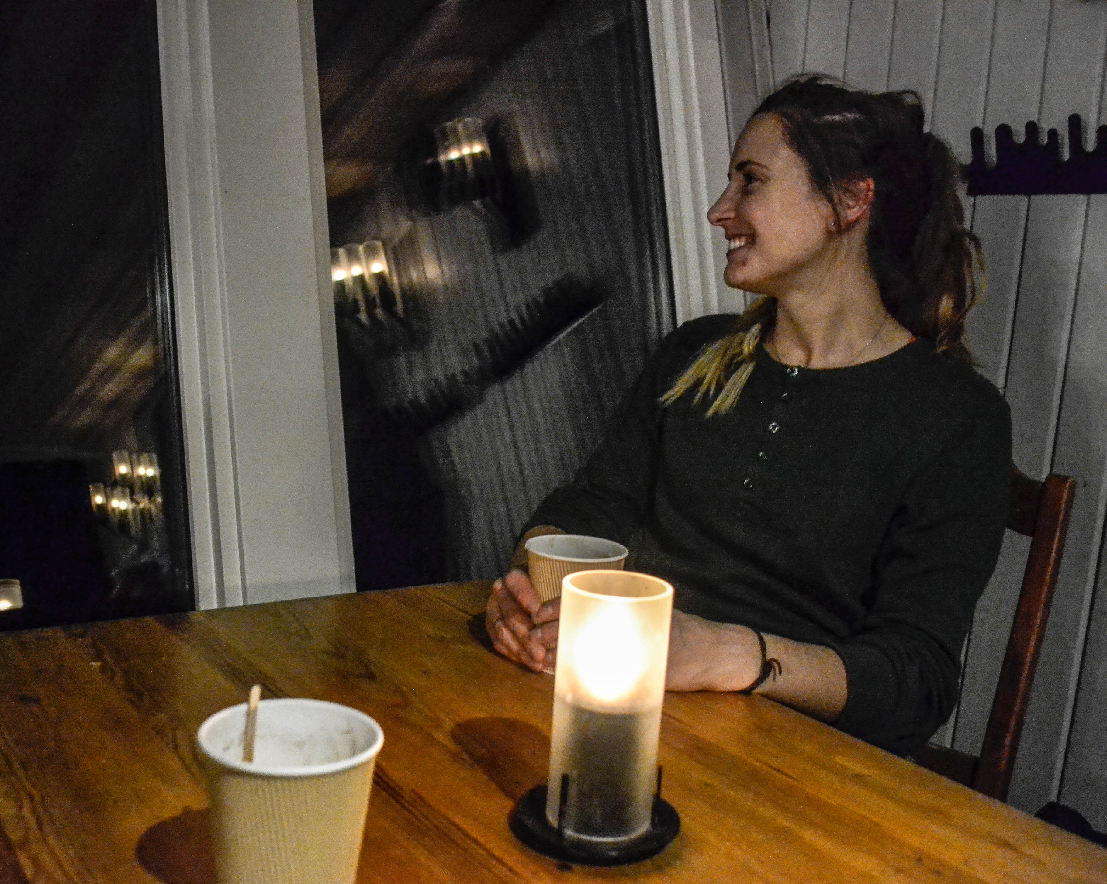 Lappjordhytta tillhör den Norska turistföreningen, stugan är luftig och täckena är stora och tjocka. Vi lagar middag och äter tillsammans i skenet från stearinljusen. Ute stiger månen upp och fäller långa skuggor över landskapet. Himlen klarnar upp och stjärnorna tindrar klart. Dimma drar in över träsket och det är ogreppbart vackert. Så tyst och stilla.