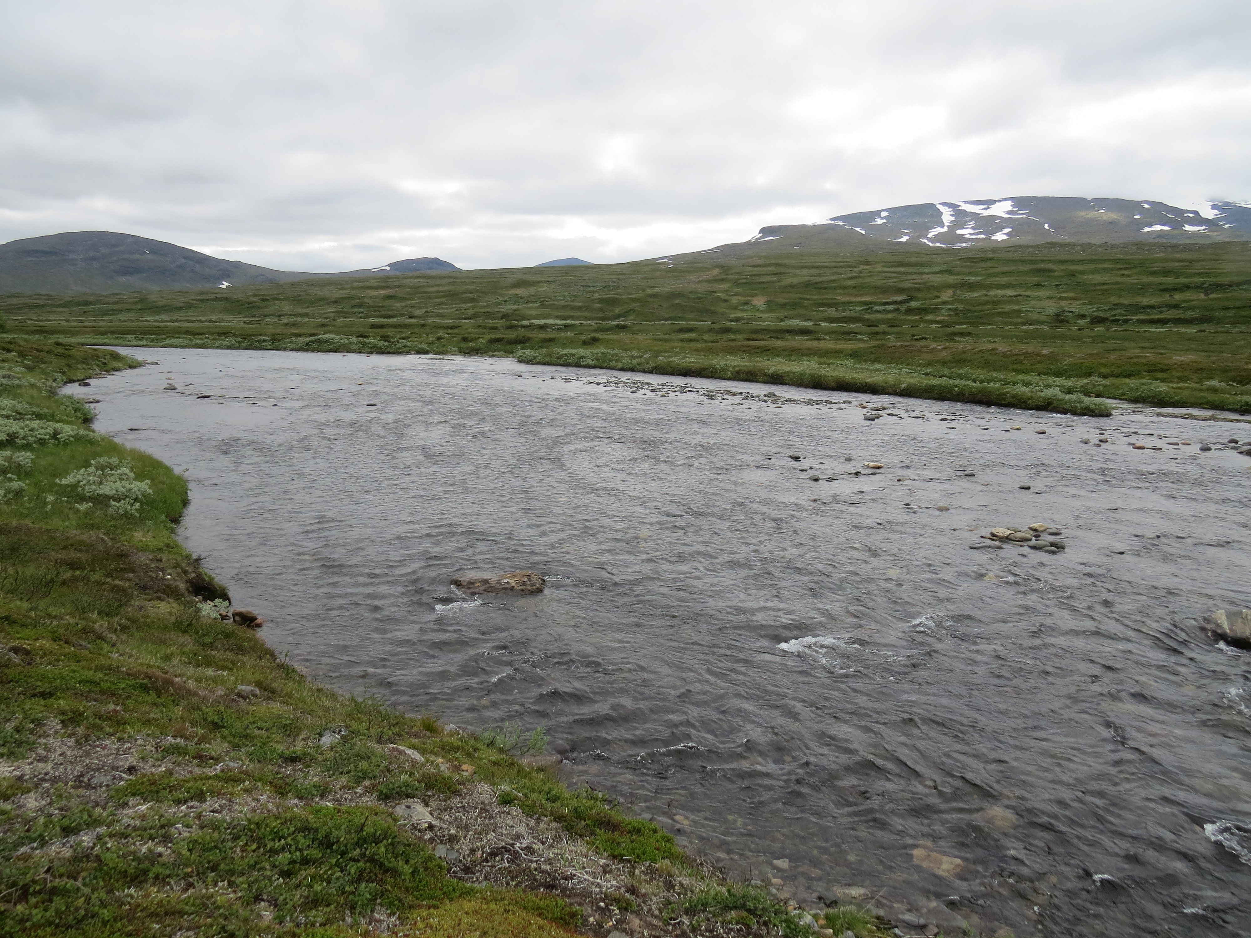 Jag fortsätter på norra sidan av Enan, stigen slingrar sig fram genom landskapet och utefter älven. Ibland försvinner den och så helt plötsligt hittar jag den igen. Myrmarker, fjällhedar, sandåsar och fjällbjörkskog. Jag vänder mig om och blickar tillbaka mot massivet och svävar iväg i tankarna. Tänk att för länge sen gick här vandrare på väg mot toppen, samma topp som vi fortfarande besöker, men i en helt annan tid.