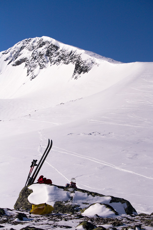 Precis vid krönet där man för försat gången ser Gåsens fjällstuga väljer vi att ta mer höjd, upp mot toppen. Snön är magisk, vi svänger och glider ner till stugan. Pratar med stugvärdsparet och kliver på. Två timmar senare har våra två vänner äntligen anlänt, elden i kaminen sprakar och vi tar oss återigen ut för att skida uppåt. Vi spanar in solnedgången, ljuset är magiskt och ovant och vi svänger i den mjuka och mest fantastiska snön. Inne påbörjar vi våran 3-rätters i stearinljusets sken.