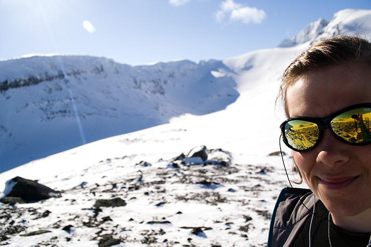 Vi lämnar stationen bakom oss och tar oss sakta upp för backen. När vi rundar krönet i sadeln mellan herr- och fruntimmersklumpen breder vidderna ut sig. Jag är lite feg så jag skråar den första biten utför tills jag vågar släppa på och ta några telemarkssvängar på turskidorna. Snön är härligt mjuk trots allt och min vän passar på och tar ut svängarna ordentligt. Jag ramlar ett par gånger, han skakar bara på huvudet och vi skrattar.